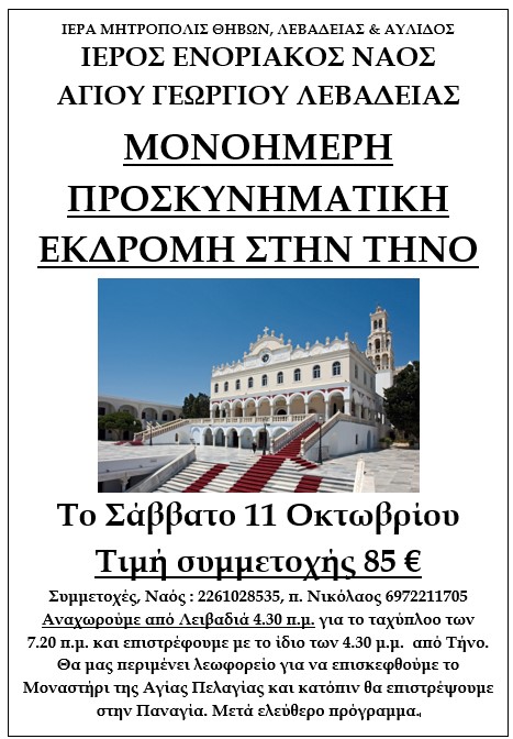 ΣΑΒΒΑΤΟ 11/10ου: πραγματοποιούμε μονοήμερη προσκυνηματική εκδρομή στην Τήνο (επίσκεψη στην Παναγία και στο μοναστήρι της Αγίας Πελαγίας) Τιμή συμμετοχής 85 € (περιλαμβάνει ακτοπλοϊκά εισιτήρια και μετάβαση από & προς την Ραφήνα με το ταχύπλοο. ΟΙ ΕΝΔΙΑΦΕΡΟΜΕΝΟΙ ΔΗΛΩΣΤΕ ΕΓΚΑΙΡΑ στο παγκάρι (2261028535) ή στον π. Νικόλαο (6972211705) αφήνοντας ένα τηλέφωνό σας.