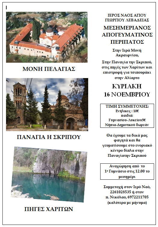 Τελικά την ΚΥΡΙΑΚΗ 16/11ου θα πραγματοποιήσουμε μεσημεριανό-απογευματινό περίπατο στην Παναγία την Σκριπού, στις πηγές Χαρίτων, στην Μονή Πελαγίας Ακραιφνίου κλπ.. Η τιμή και άλλες λεπτομέρειες θα ανακοινωθούν εντός της εβδομάδας.